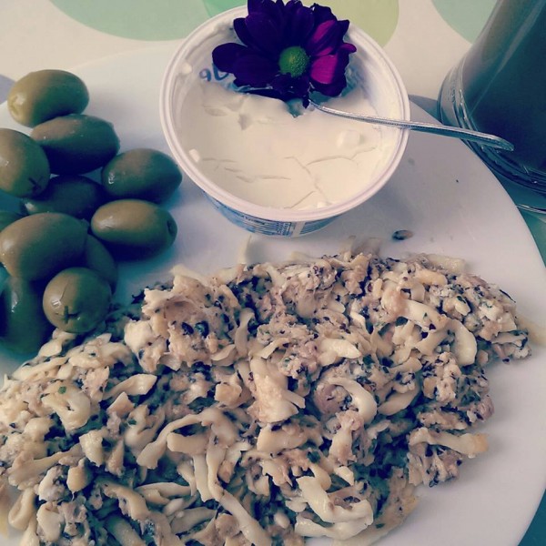 Príprava :) : Na kokosovom oleji som osmahla nudle do zlatova. Potom som posypala ľanovými semienkami a ešte chvíľu popražila. Pridala som celú konzervu tuniaka a 1 PL cottage, ktorý sa vám v tom pekne rozpustí a celé meal zjemní a zahustí :). Následne šupnúť už len vajíčka a celé to na panvičke premiešať, kým nie sú vajka al dente. Na ochutenie som použila len soľ a italskú bylinkovú zmes. Ako prílohu som zvolila zelené olivy a samozrejme som dopapala aj otvorený cottage. Po tomto obede budete mať bruško spokojné nadlho :)))