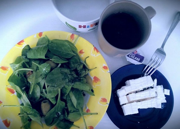 Obed = feta syr, šalát (špenát, olivy, vlašské orechy, citrónová štava a lyžicka olivového oleja) plus káva so smotanou...