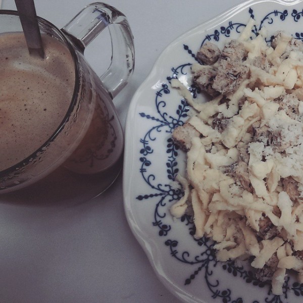 Obed = cestoviny šmakounik na sladko = šmakoun nudle, šmakoun švestka, struhaný kokos...celé osmahnuté na kokosovom oleji a k tomu kafiiičko s 33% smotanou...