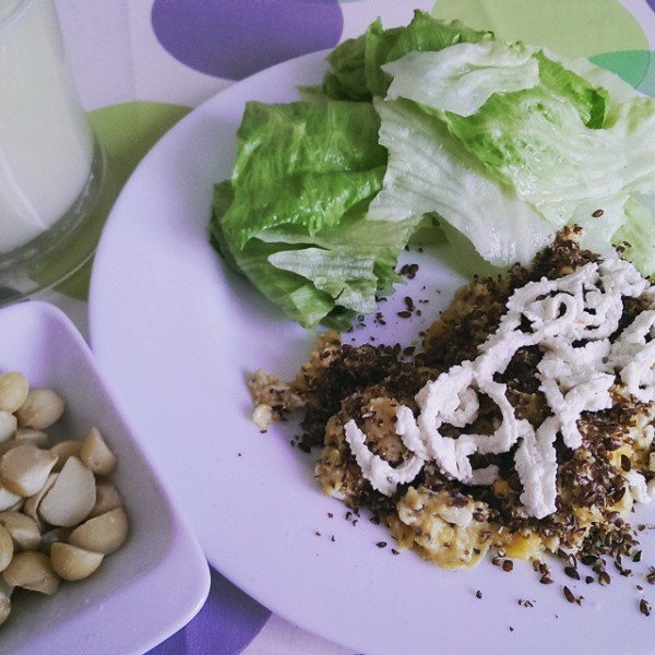 Ranajky = praženica - tri vajíčka (celé) na repkovom oleji, posypané ľanovými semienkami. Navrh bio sojová pomazánka a ochutené majoránkou. Jako příloha ľadový šalát. Nesmú chýbať ořechy, v tomto prípade makadamy a moja nakopávačka zelený čaj, do kterého pridávam jednu smotanku do kávy...